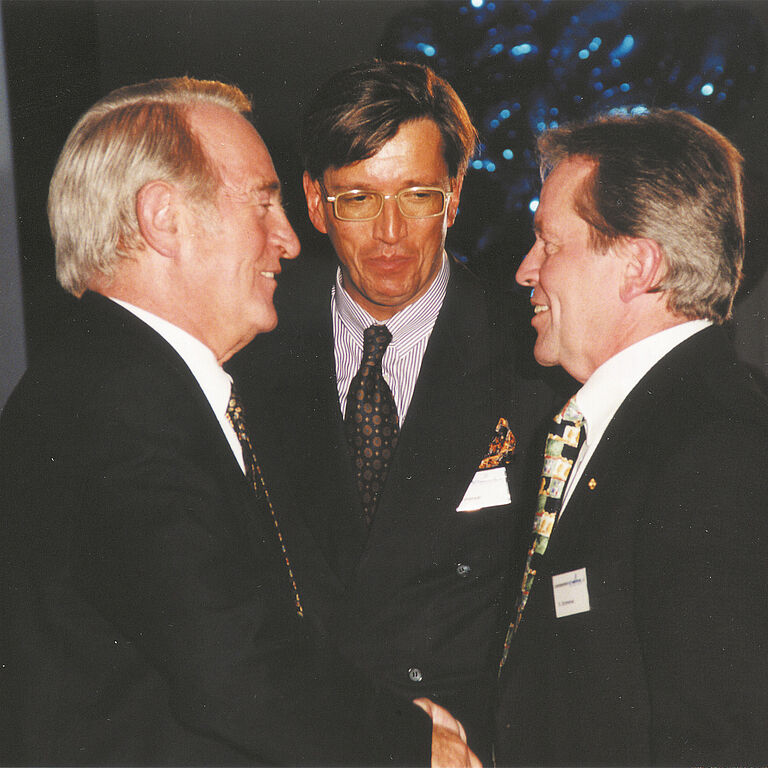 Schmersal celebrates its 50th anniversary: the then Minister President of North-Rhine Westphalia, Johannes Rau, congratulates Stefan and Heinz Schmersal.