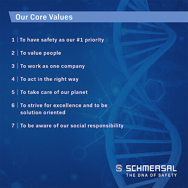 We are accountable and act with integrity in a honest, transparent and responsible manner in order to protect the reputation of the Schmersal Group as a family business and its people.