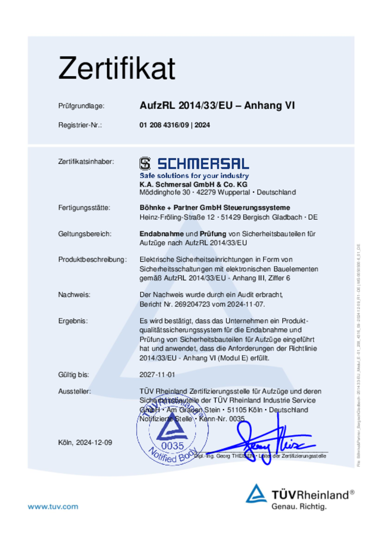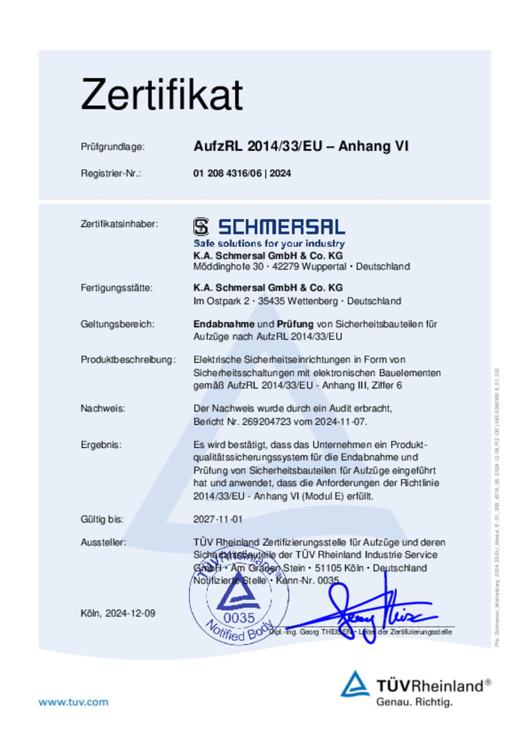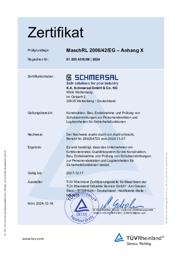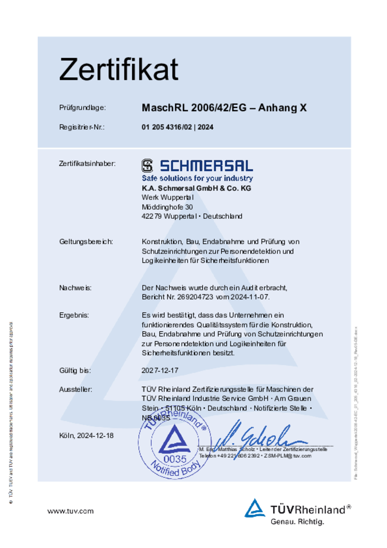 Certification in accordance with Appendix X of the Machinery Directive (“Comprehensive Quality Assurance”) at the Wuppertal and Wettenberg sites means that we can develop, test and release our own machine safety components. At the same time, it confirms the high quality level and expertise of the sites.