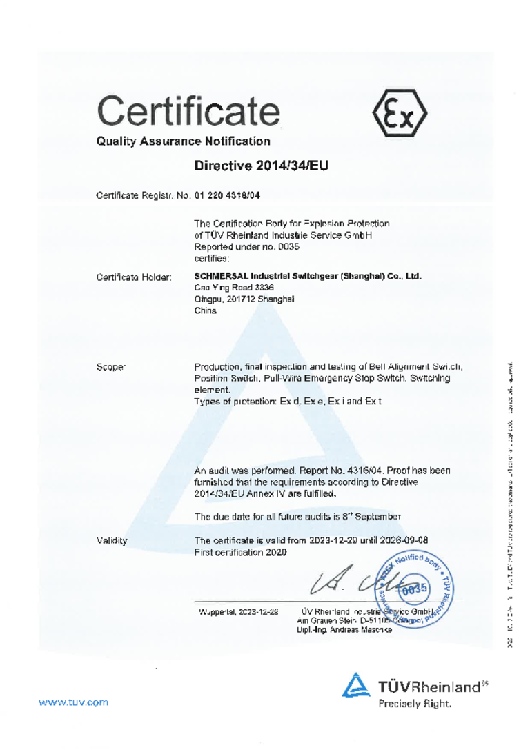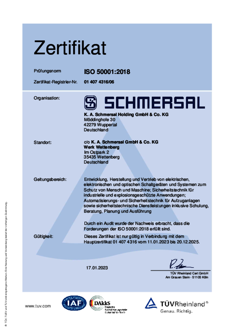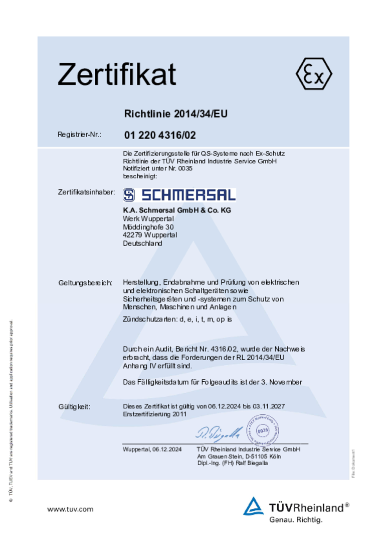 All Schmersal Group sites developing and producing switchgear for explosion-protected applications also have certification in accordance with DIN EN ISO 9001, which stipulates certification and approvals for the QM system based on the applicable guidelines and standards. This is another feature of the high quality standards of the Schmersal Group. This guarantees the requisite safety in the very sensitive area of (safety) switchgear for explosion-risk environments.