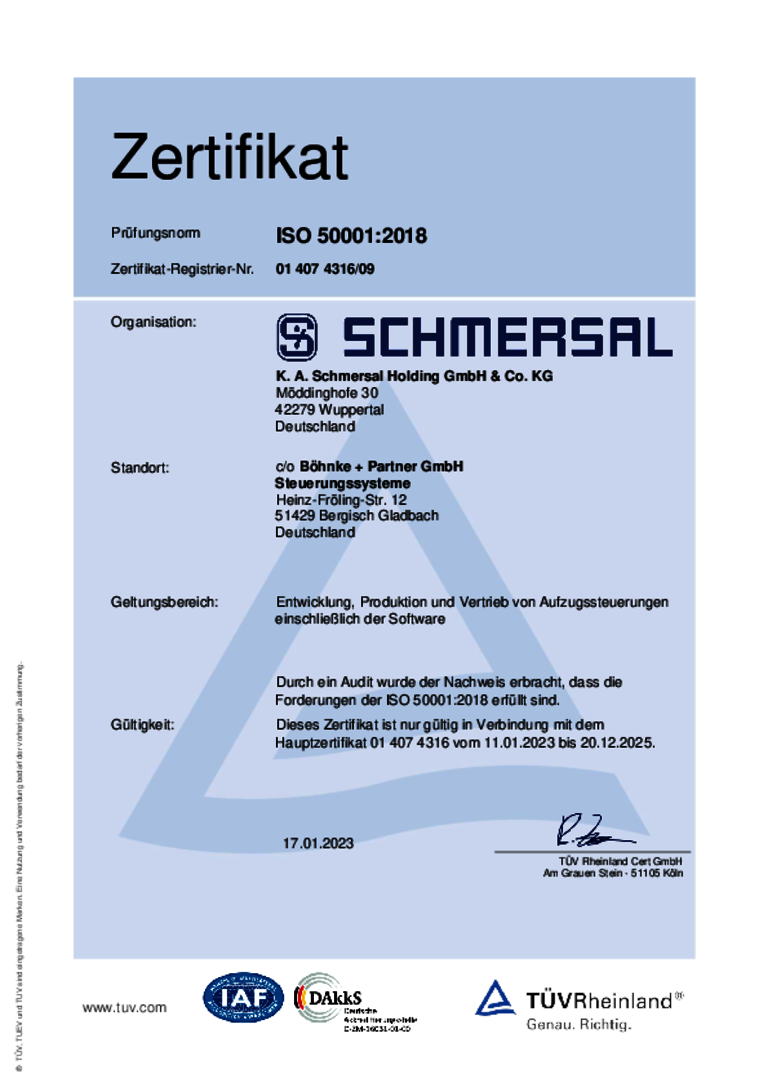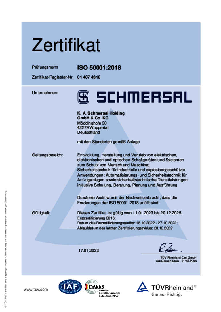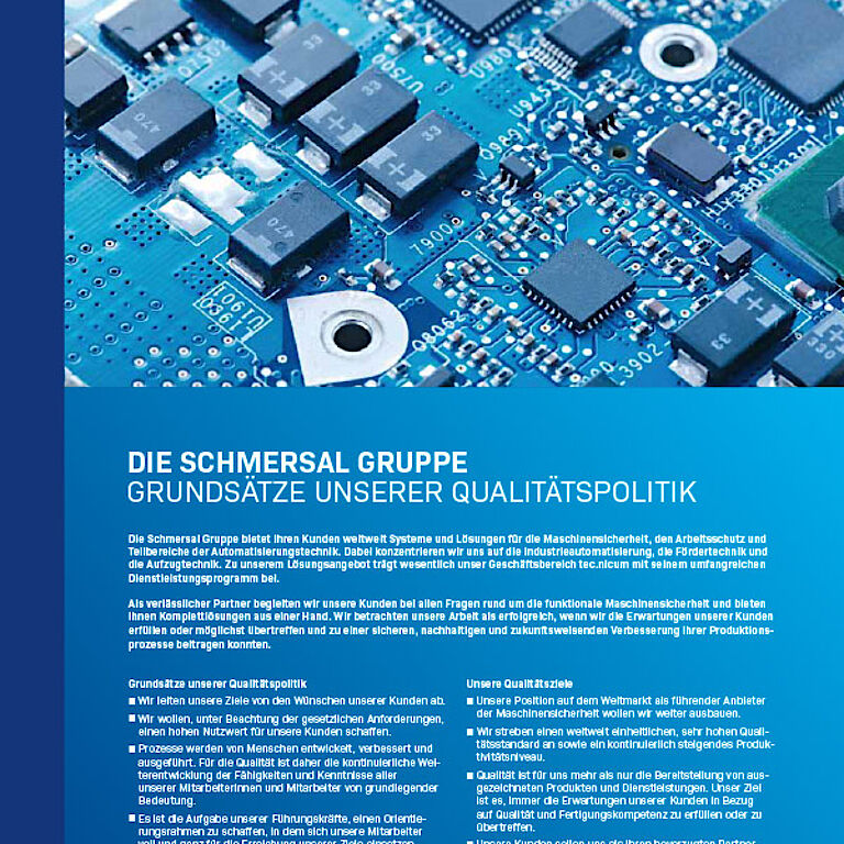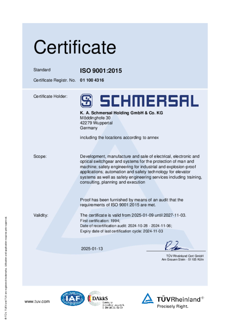 All production subsidiaries of the Schmersal Group work on the basis of a quality management system which is certified in accordance with DIN EN ISO 9001. The QM system is modular in design and sets out clear rules for all processes and workflows within the company.