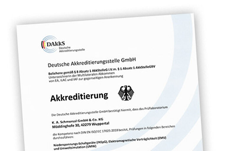 The well-equipped Schmersal laboratory at the Wuppertal site is recognised by DAkks, the German accreditation body, and accredited in line with DIN EN ISO/IEC 17025. This means it can take responsibility for qualifying low-voltage switchgear based on the requirements of applicable international standards.