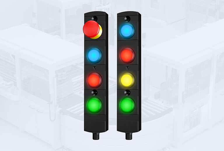 The DHS door handle system combines the functions of a robust door handle with the indication of machine status via the handle lighting. The handle uses seven different colours to signal different machine statuses over a large area. The user can control the colours individually to signal the defined machine statuses.