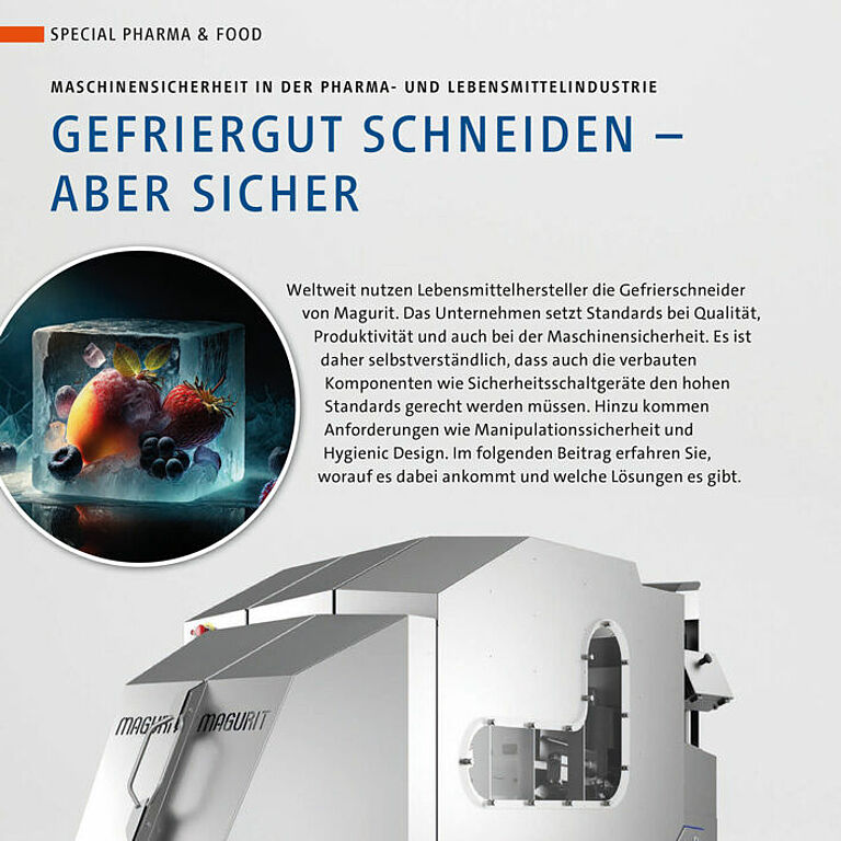 Food manufacturers around the world use Magurit freeze cutters. The company sets standards in terms of quality, productivity and machine safety. It therefore goes without saying that the components installed, such as safety switchgear from Schmersal, must also fulfil the high standards. Added to this are requirements such as tamper protection and hygienic design. In the following article, you will find out what is important and what solutions are available.