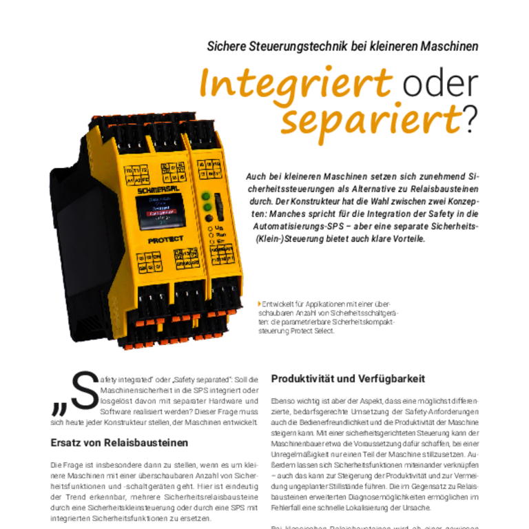 Drive technology and the safety of machinery go hand in hand: in addition to an integrated solution encompassing safe drive systems and PLCs, safety mini-controllers like the Protect PSC1 from Schmersal also allow safety monitoring of drive-related parameters such as speed, acceleration, and position. Plus, thanks to communication modules, integration into the control and management level is straightforward, including with OPC UA if required.