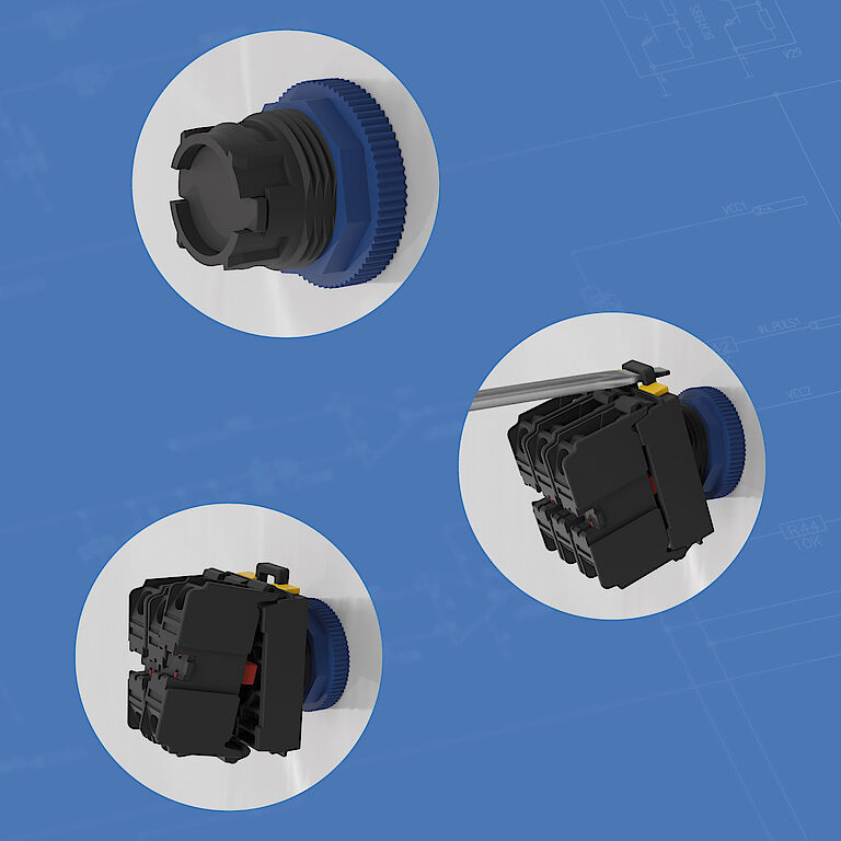 A total of 147 different devices are available, including 26 mushroom pushbuttons, 24 selector switches with two or three positions and four potentiometer-rotary switches. The designer of a food-processing machine can freely decide which type of command device from the H range he wishes to use for the design of the HMI. With its wide range of different hygienic switchgear devices, the H range is unique to the market. In addition, and also new, the designer can order these command and signalling devices with individual laser marking, e.g. as an OEM version with logo.