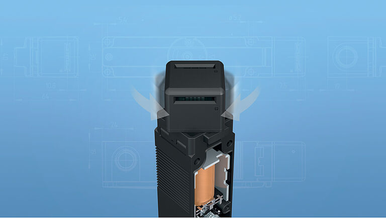 Ein Pluspunkt bei der Zuhaltung AZM150 ist der drehbare Betätigerkopf, der – statt durch Verschraubung – durch einfaches Aufsetzen des Deckels arretiert wird. Der um 360° drehbare Betätigerkopf mit seinen zwei Betätigereinführungen ermöglicht verschiedene Montagepositionen und Anfahrmöglichkeiten. Damit ist die Zuhaltung vielseitig einsetzbar.