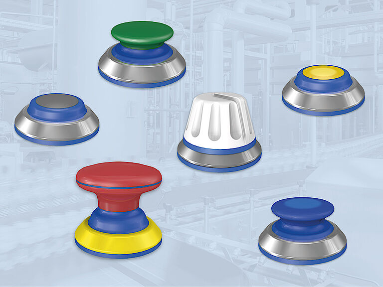 In der neuen H-Serie sind verschiedene Bauarten von Schaltgeräten in hygienegerechter Ausführung verfügbar: Drucktaster, Leuchtmelder, Wahlschalter, Hauptschalter und Not-Halt-Geräte.