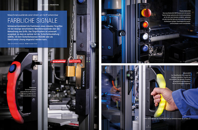 Schmersal kombiniert die Funktionen eines robusten Türgriffes mit der Anzeige verschiedener Maschinenzustände über die Beleuchtung des Griffs. Das Türgriffsystem ist universell ausgelegt, so dass es optimal mit der Sicherheitszuhaltung AZM40, mit dem Sicherheitssensor RSS260 oder als Stand-alone-Lösung eingesetzt werden kann.