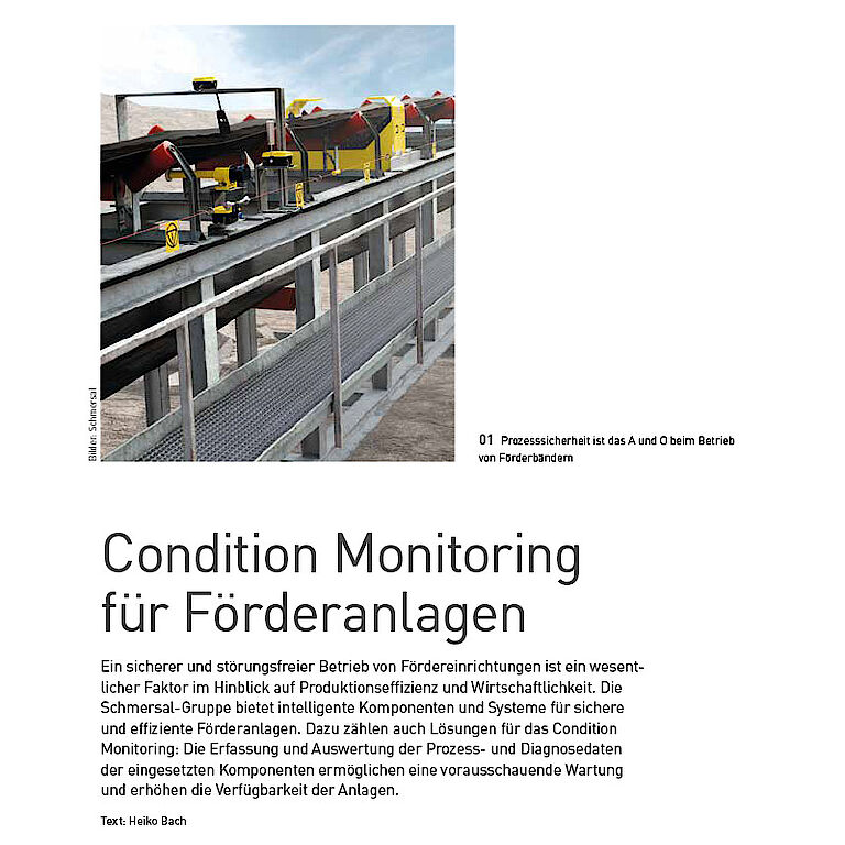 Ein sicherer und störungsfreier Betrieb von Fördereinrichtungen ist ein wesentlicher Faktor im Hinblick auf Produktionseffizienz und Wirtschaftlichkeit. Die Schmersal-Gruppe bietet intelligente Komponenten und Systeme für sichere und effiziente Förderanlagen. Dazu zählen auch Lösungen für das Condition Monitoring: Die Erfassung und Auswertung der Prozess- und Diagnosedaten der eingesetzten Komponenten ermöglichen eine vorausschauende Wartung und erhöhen die Verfügbarkeit der Anlagen.