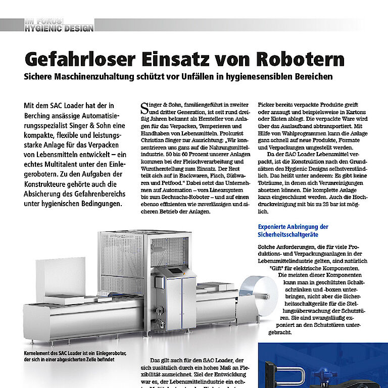 Mit dem SAC Loader hat der in Berching ansässige Automatisierungsspezialist Singer & Sohn eine kompakte, flexible und leistungsstarke Anlage für das Verpacken von Lebensmitteln entwickelt – ein echtes Multitalent unter den Einlegerobotern. Zu den Aufgaben der Konstrukteure gehörte auch die Absicherung des Gefahrenbereichs unter hygienischen Bedingungen.