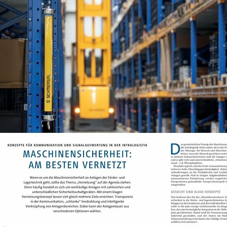 Wenn es um die Maschinensicherheit an Anlagen der Förder- und Lagertechnik geht, sollte das Thema „Vernetzung“ auf der Agenda stehen. Denn häufig hallendelt es sich um weitläufige Anlagen mit zahlreichen und unterschiedlichen Sicherheitsschaltgeräten. Mit einem klugen Vernetzungskonzept lassen sich gleich mehrere Ziele erreichen: Transparenz in der Kommunikation, „schlanke“ Verdrahtung und intelligente Verknüpfung von Anlagenbereichen. Dabei kann der Anlagenbauer aus verschiedenen Optionen wählen.