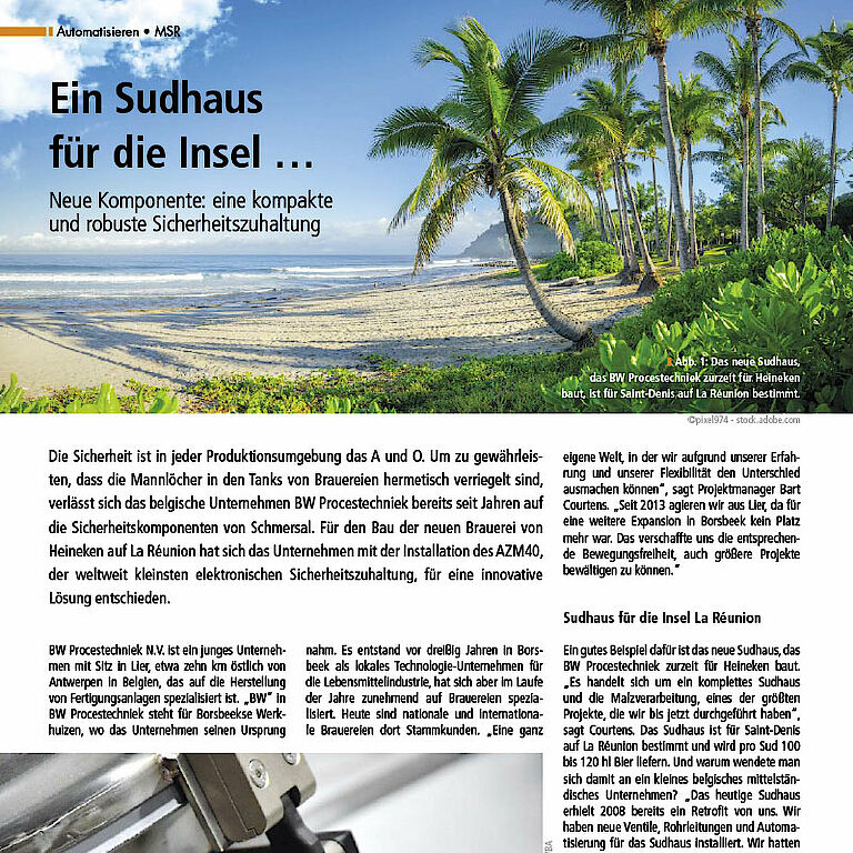 Die Sicherheit ist in jeder Produktionsumgebung das A und O. Um zu gewährleisten, dass die Mannlöcher in den Tanks von Brauereien hermetisch verriegelt sind, verlässt sich das belgische Unternehmen BW Procestechniek bereits seit Jahren auf die Sicherheitskomponenten von Schmersal. Für den Bau der neuen Brauerei von Heineken auf La Réunion hat sich das Unternehmen mit der Installation des AZM40, der weltweit kleinsten elektronischen Sicherheitszuhaltung, für eine innovative Lösung entschieden.