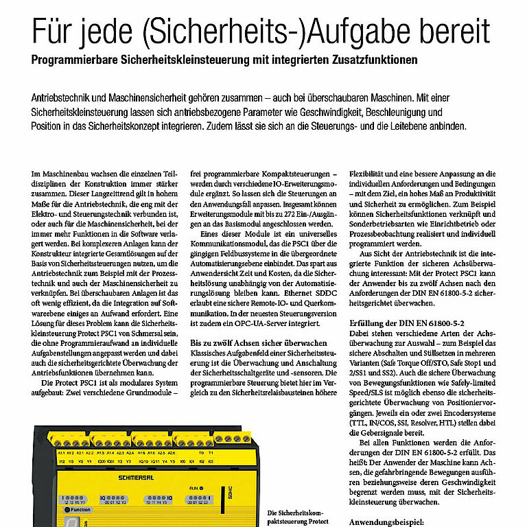 Antriebstechnik und Maschinensicherheit gehören zusammen – auch bei überschaubaren Maschinen. Mit einer Sicherheitskleinsteuerung lassen sich antriebsbezogene Parameter wie Geschwindigkeit, Beschleunigung und Position in das Sicherheitskonzept integrieren. Zudem lässt sie sich an die Steuerungs- und die Leitebene anbinden.