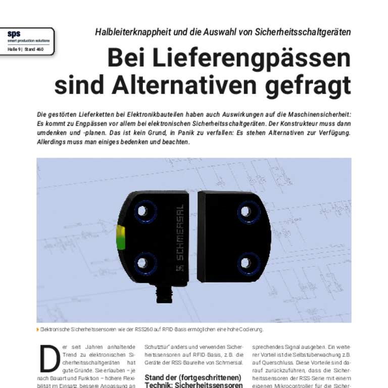 Die gestörten Lieferketten bei Elektronikbauteilen haben auch Auswirkungen auf die Maschinensicherheit: Es kommt zu Engpässen vor allem bei elektronischen Sicherheitsschaltgeräten. Der Konstrukteur muss dann umdenken und -planen. Das ist kein Grund, in Panik zu verfallen: Es stehen Alternativen zur Verfügung. Allerdings muss man einiges bedenken und beachten.