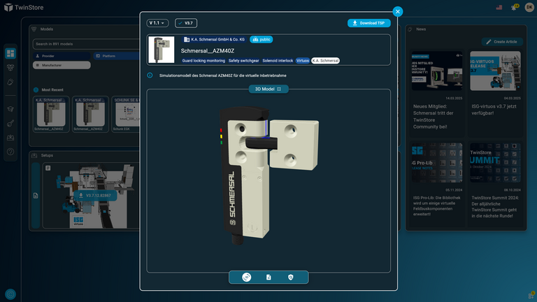 The 4D model of the AZM40 was also the first Schmersal component to be published and made available in the "TwinStore" – an online store for prefabricated and ready-to-use 4D simulation models. The release of the AZM40 as the first TwinStore package marks the start of a successive expansion of the Schmersal Group's digital model catalogue.