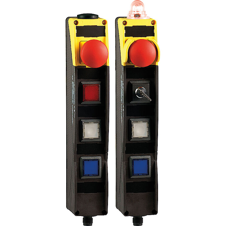 Befehlsgeräte und Meldegeräte kommen immer dann zum Einsatz, wenn es um die sichere Kommunikation zwischen Menschen und Maschinen geht. Typische Anwendungsfälle sind das Aktivieren kritischer Maschinenfunktionen oder spezieller Betriebsarten sowie das sichere Stoppen gefahrbringender Bewegungen von Anlagen- und Maschinenkomponenten.