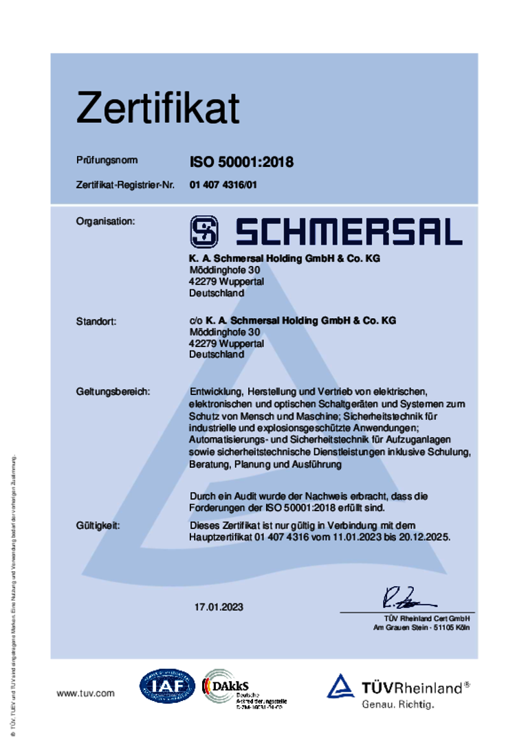 In der Schmersal Gruppe ist die bestmögliche Reduzierung des spezifischen Energieverbrauchs ein wichtiger Bestandteil der Unternehmenspolitik. Die Grundsätze unserer Energiepolitik sowie unsere Energieziele haben wir für unser Unternehmen verbindlich definiert.