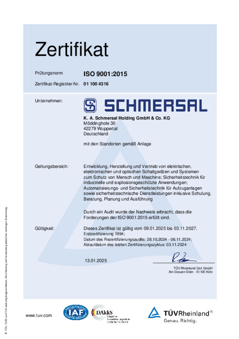 Alle produzierenden Tochtergesellschaften der Schmersal Gruppe arbeiten auf der Grundlage eines Qualitätsmanagementsystems, das gemäß DIN EN ISO 9001 zertifiziert ist. Das QM-System ist modular aufgebaut und setzt klare Regeln für alle Prozesse und Abläufe im Unternehmen.